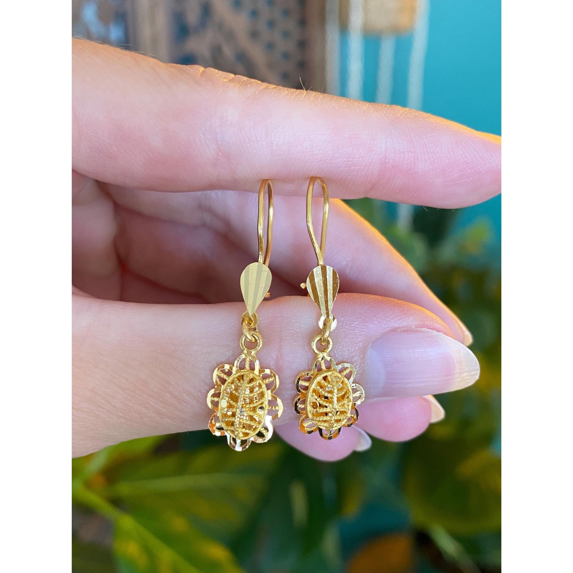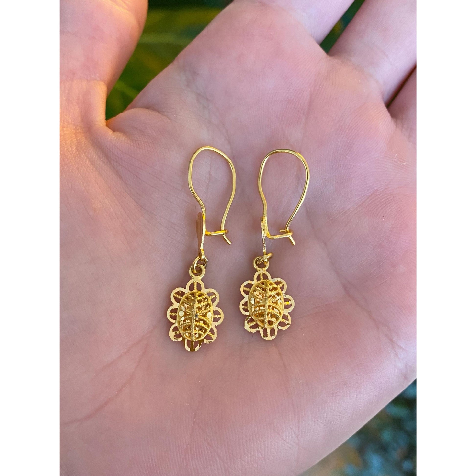 Vintage Solid 21k Yellow Gold Diamond Cut Flower Dangles